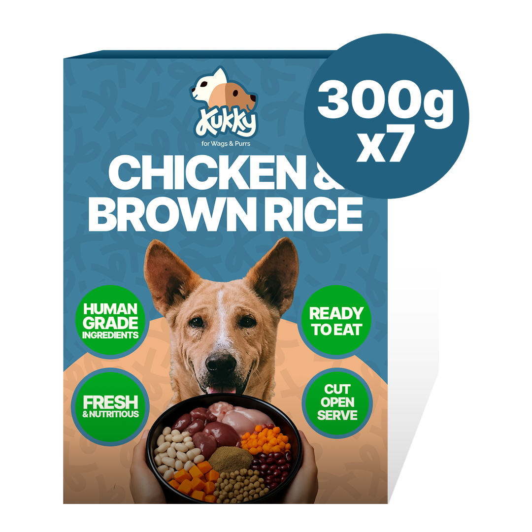 Crafted for the health and happiness of your dog, Kukky’s Chicken & Brown Rice recipe is a powerhouse of nutrition with a taste dogs love. Made with lean boneless chicken, nutrient-rich organ meats (liver + heart), and a soothing blend of destarched brown rice, pumpkin, sweet potato, and Ooty carrots, this meal fuels your dog with everything they need—and nothing they don’t.