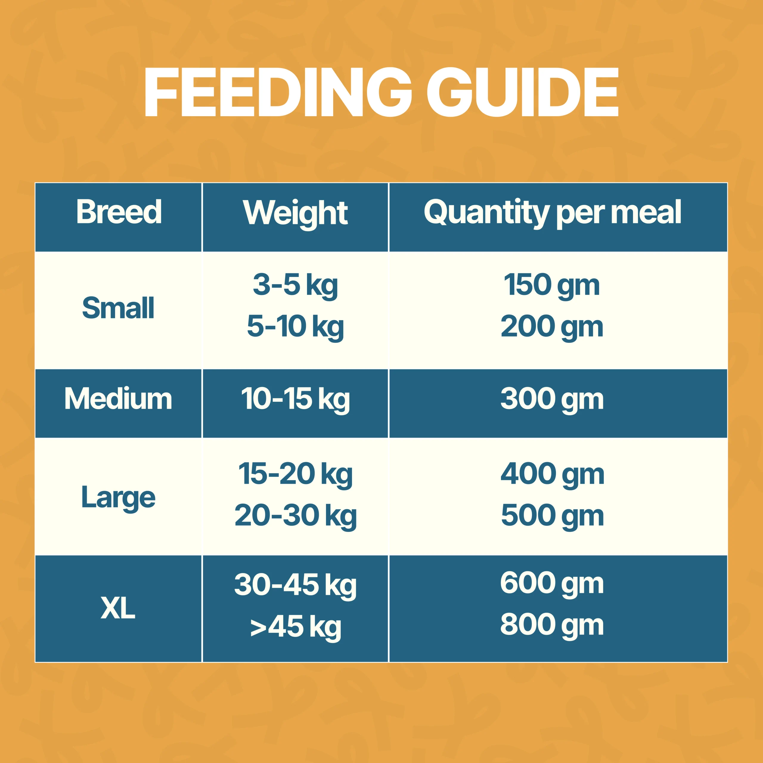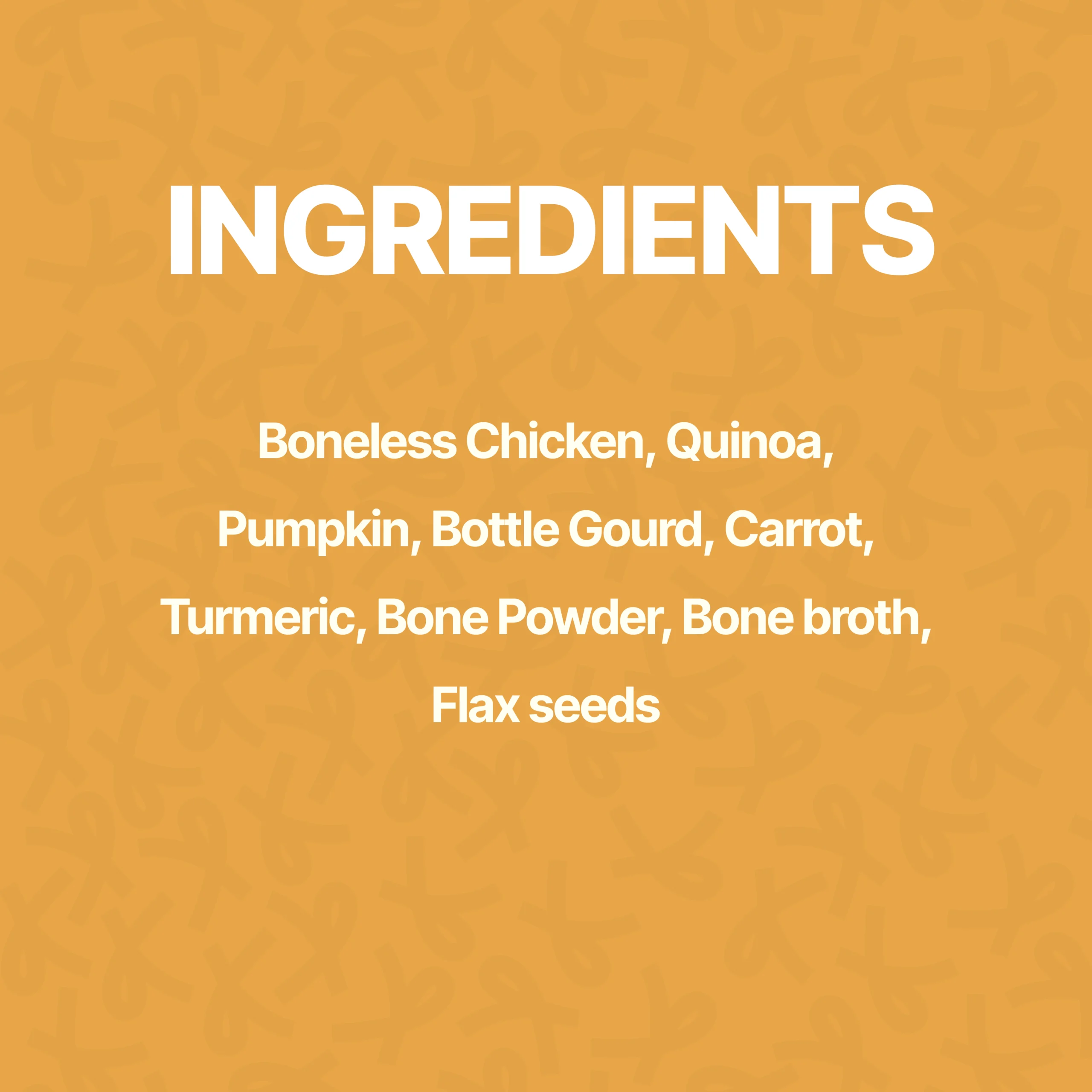 Ingredients: Boneless chicken, quinoa, pumpkin, bottle gourd, carrot, turmeric, bone powder, bone broth, flaxseeds.