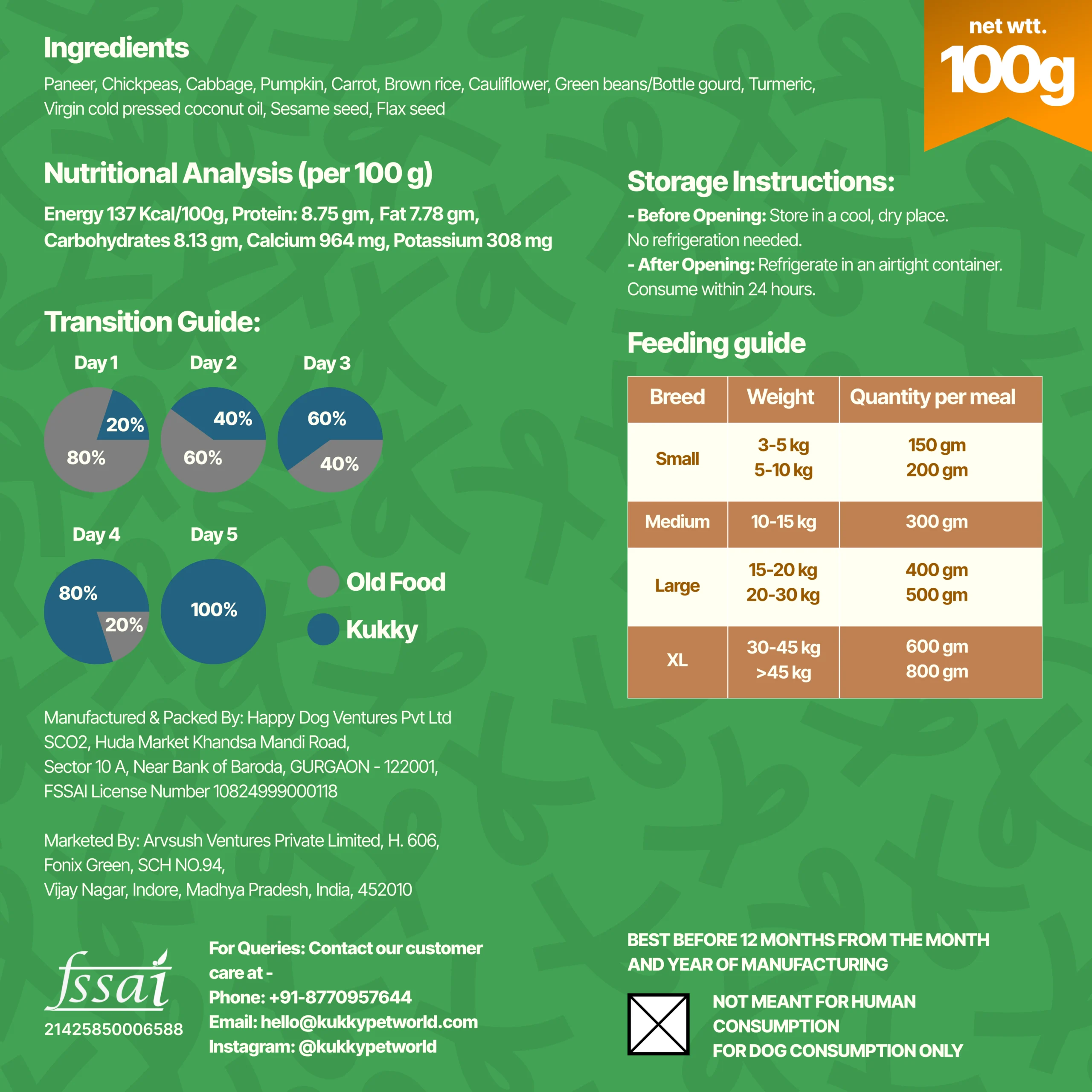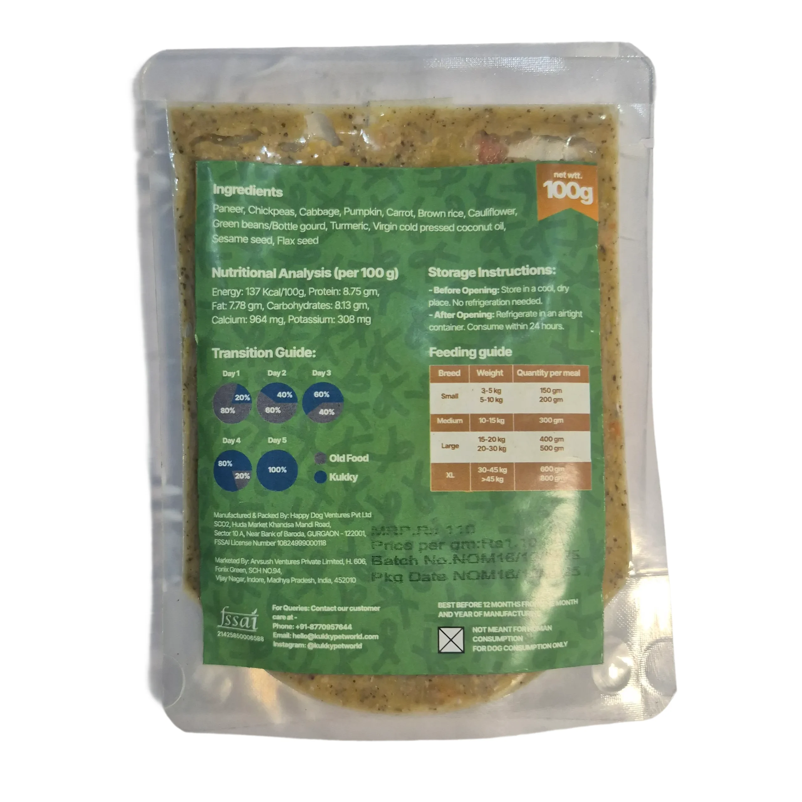 A wholesome, pure-veg, premium dog meal made with paneer + chickpeas for a tasty, satisfying protein combo. Balanced with brown rice for gentle energy, and a veggie mix of pumpkin, carrot, cabbage, cauliflower, and green beans/bottle gourd to support smooth digestion and everyday gut health.