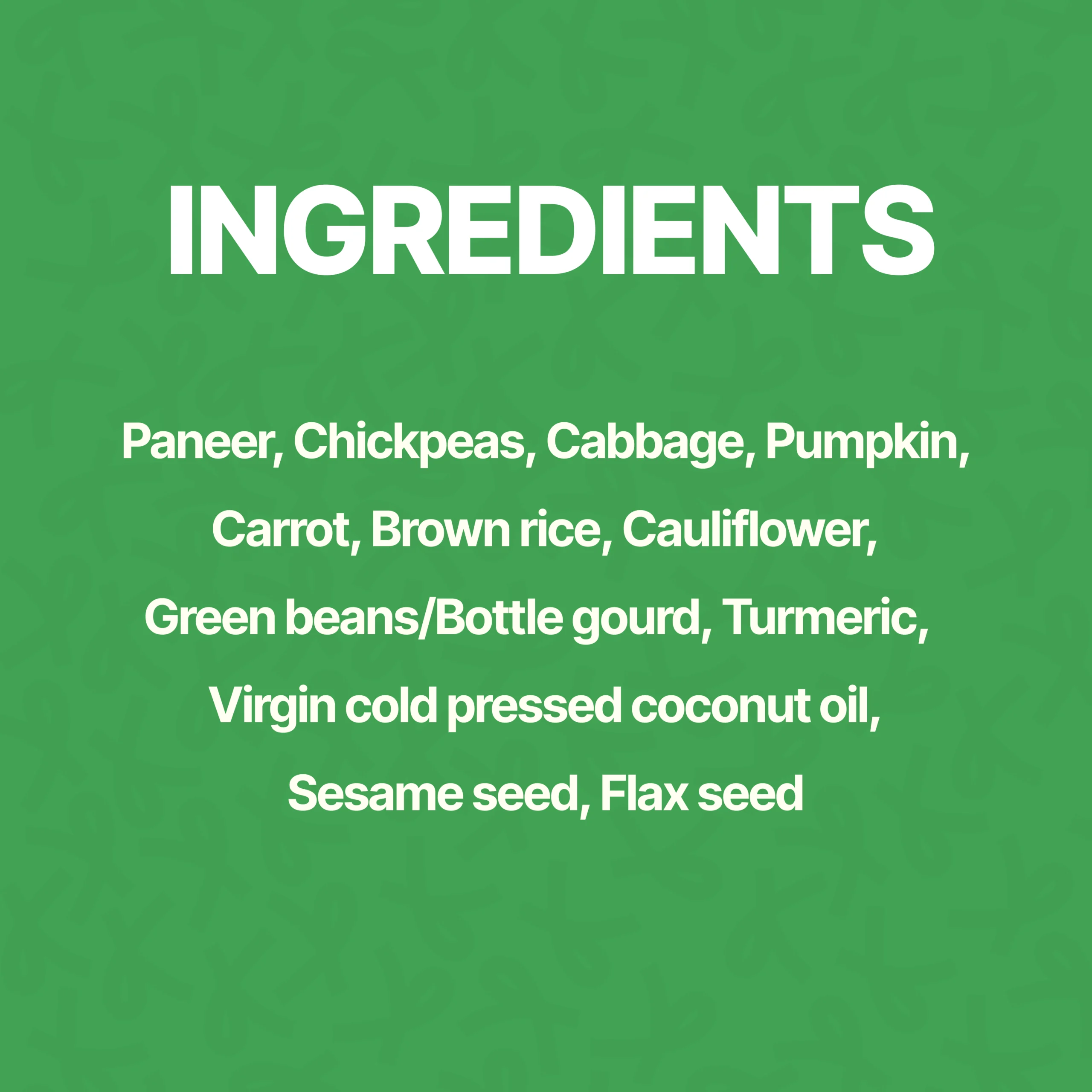 Ingredients: Paneer, chickpeas, cabbage, pumpkin, carrot, brown rice, cauliflower, green beans/bottle gourd, turmeric, virgin cold-pressed coconut oil, sesame seed, flaxseed.